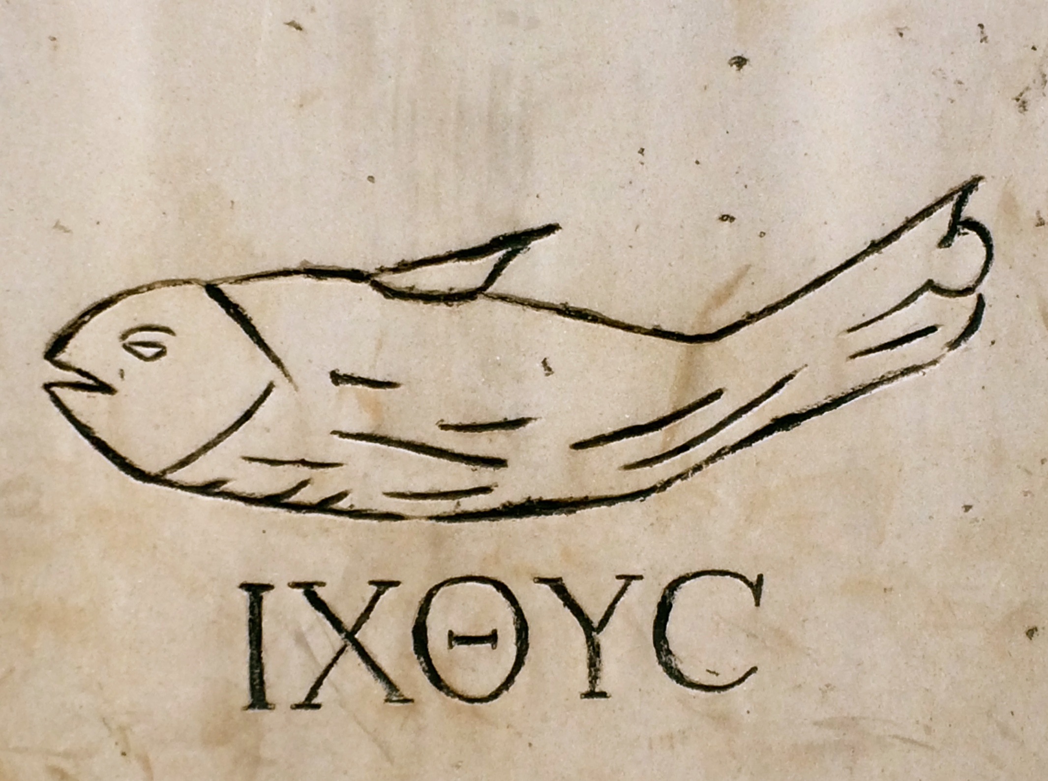 Most of us have seen paintings of Jesus in the manger, or in the cross. But what about Jesus eating a fish? Some of the earliest known Christian art comes from the Roman catacombs, the vaults below the city where tens of thousands of early Christians were buried. Crosses and mangers are rarely seen there, but fish are commonplace. And not just the stylized, abstract-looking fish you see on modern car bumpers; these are actual fish, realistic-looking fish with scales. Sometimes the fish is depicted by itself; sometimes it is part of a dinner scene. There are multiple images of people gathered around a table, sharing a Eucharistic meal — not of wine and bread alone, but of loaves and fishes. To the early followers of Jesus, fish was apparently as integral to communion as bread and wine.